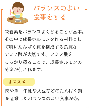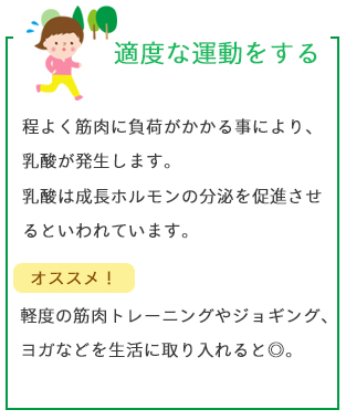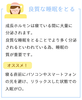 成長ホルモンが分泌されることにより、新しい細胞を生み出し、正常な細胞を作ることにつながります。成長ホルモンを正常に分泌させるためには『運動』『睡眠』『食事』への意識が欠かせません。