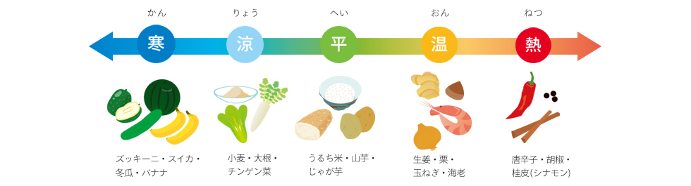 薬膳の考え方のひとつに「五性」という考え方があります。これは、食材が持つ、カラダを温めたり、冷やしたりという性質のことを指し、度合いにより、寒・涼・平・温・熱の5つに分けられます。