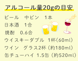 厚生労働省は国民の健康増進を図るために作成をした「健康日本21」の中で「節度ある適度な飲酒」を「通常のアルコール代謝能を有する日本人においては、節度ある適度な飲酒として、1日平均純アルコールで20g程度である」と示しています。個人差はありますが、日本人はアセトアルデヒドを分解する酵素が働きにくい体質の人が多いため、お酒の飲みすぎには注意しましょう。