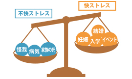 一般的に不快ストレスには、怪我や病気、失業など、どちらかというと私たちにとって、マイナスのもの、快ストレスには、結婚や妊娠・出産、イベントなどお祝い事や楽しみなどが入っています。