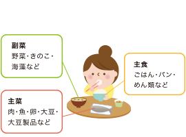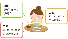 主食・主菜・副菜を組み合わせた一汁三菜の食事を摂ることで食事のバランスがよくなります。
