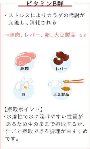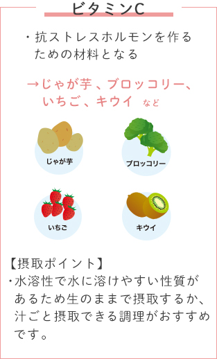 ストレスに強いカラダを作るためには「抗ストレスホルモン」を作る材料となる栄養素やストレスによって消耗しやすい栄養素を摂取することが大切です。