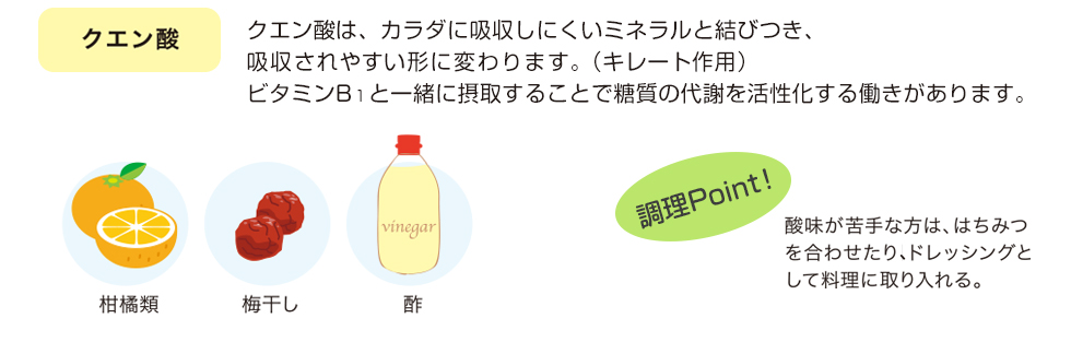 私たちが食べたものは、体内で消化、吸収されエネルギーに変換されます。食べたものがカラダの中でエネルギーを作る過程を「代謝」と言い、栄養素の代謝をよくすることで、スムーズにエネルギーが作られ、疲れにくいカラダを作ることができます。代謝をスムーズに行うために食生活を見直しましょう。