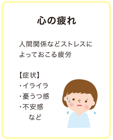 | 心の疲れ | ・満員電車によるストレス ・新しい環境や生活など精神的な不安 など |