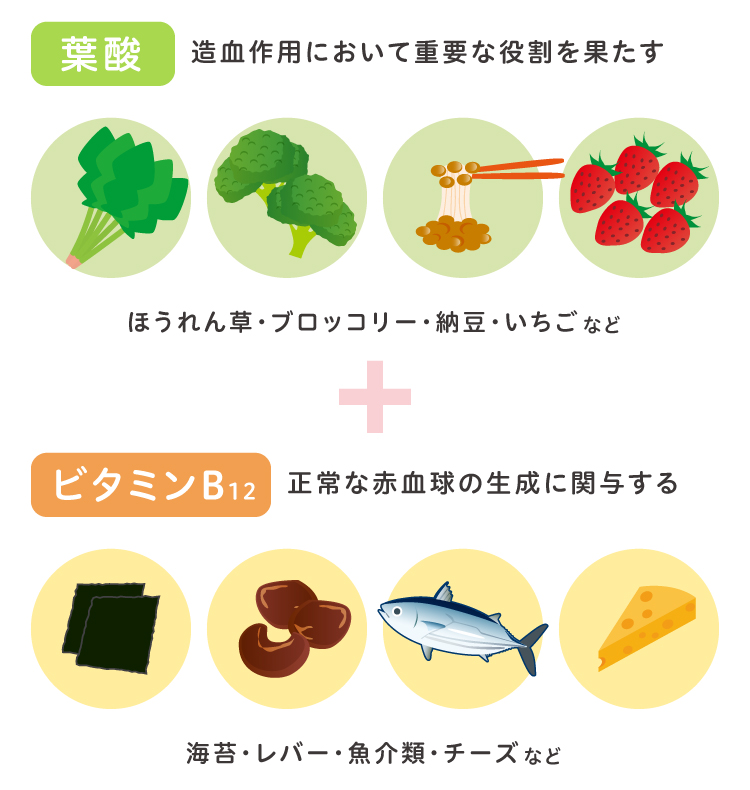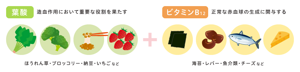 葉酸とビタミンB12は協力して、赤血球の生成に深く関わるので、一緒に摂取するようにしましょう。