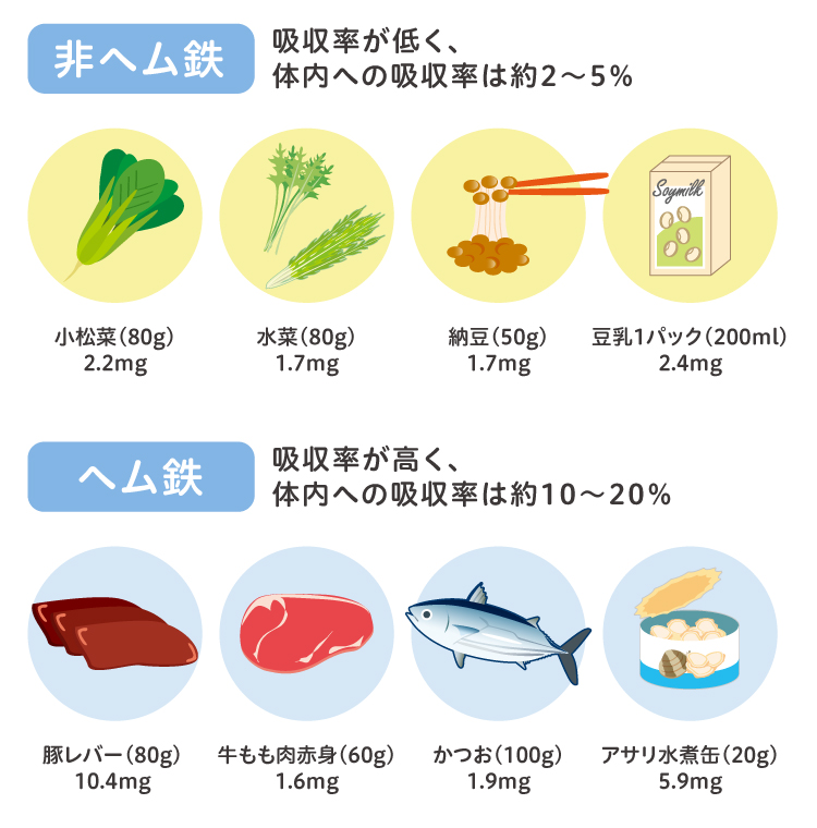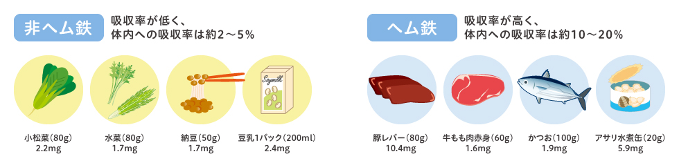 鉄はヘモグロビンを作る材料となり、カラダに酸素や栄養素を運搬します。植物性の食品に含まれる非ヘム鉄と動物性の食品に含まれるヘム鉄があります。