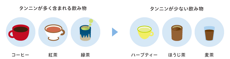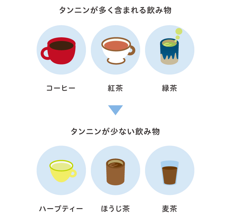 鉄の吸収を阻害する成分(タンニン)を含む飲み物は食事の際は控えましょう!