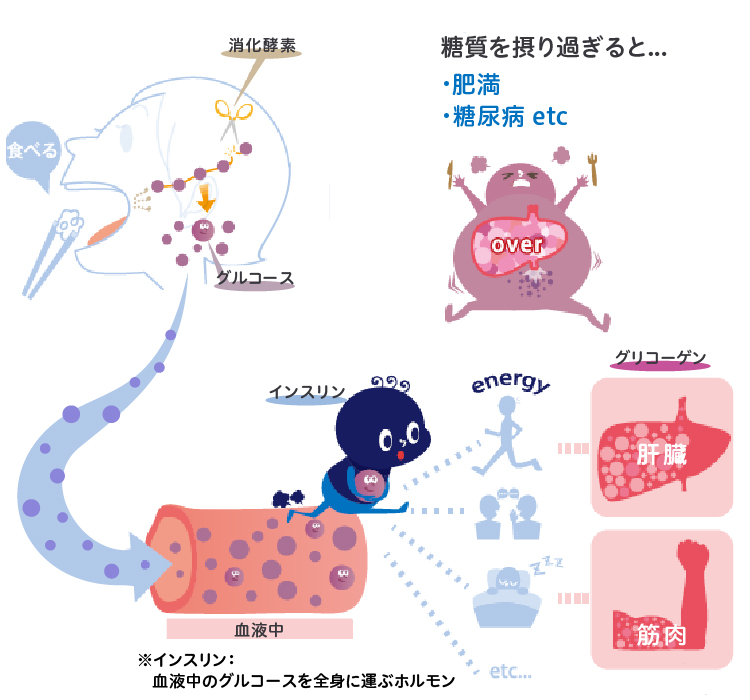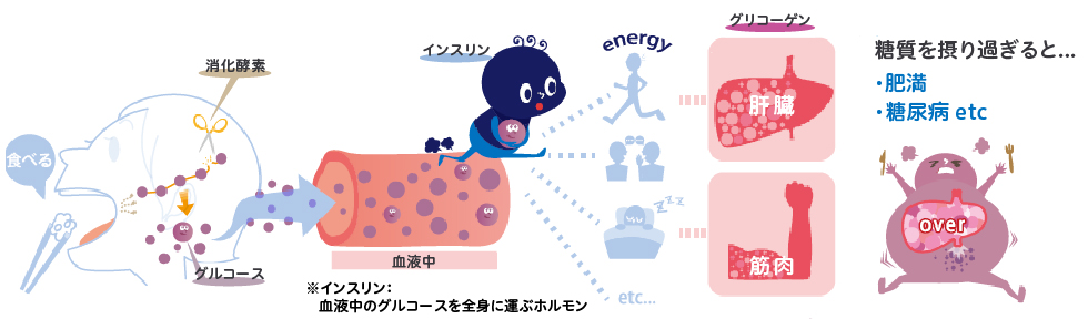 糖質を摂取すると消化酵素によりグルコースに分解され、体内に取り込みエネルギーとして消費されます。