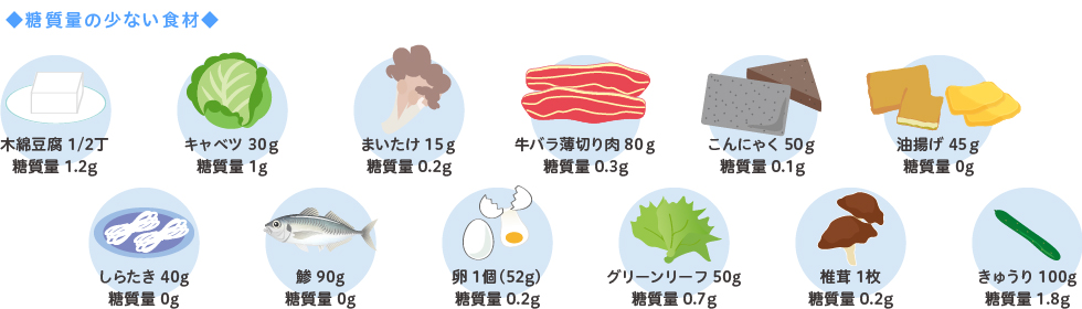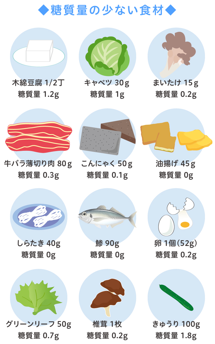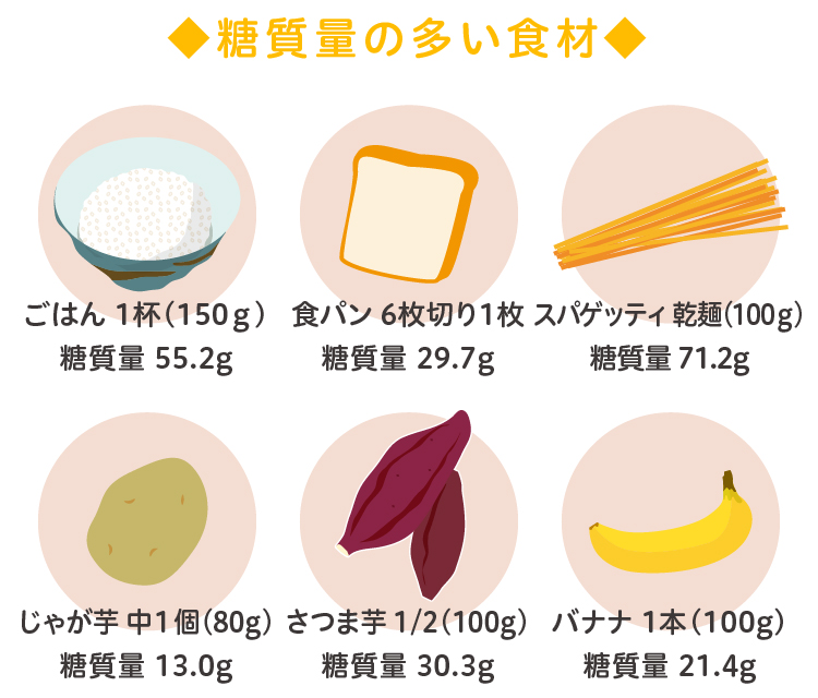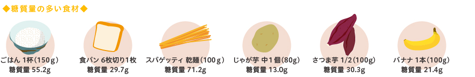 1日に必要な糖質の摂取量を知って、食材に含まれる糖質量を参考にし、適切な量の摂取を心がけましょう。