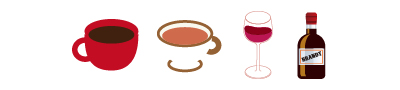 緑茶、ウーロン茶、コーヒー、紅茶などのお茶類(無糖のもの)、 焼酎、ウイスキー、ブランデーなどの蒸留酒、辛口のワインなど