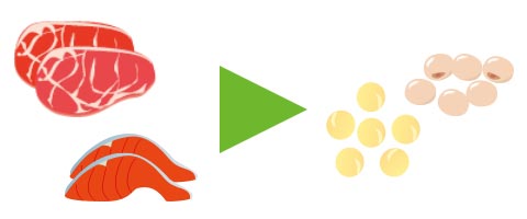 お肉・魚の代わりに「大豆」を選びましょう。調理方法によっては満足感も得られやすいです。 量は手ばかりで毎食手のひら大を目安に摂取しましょう。