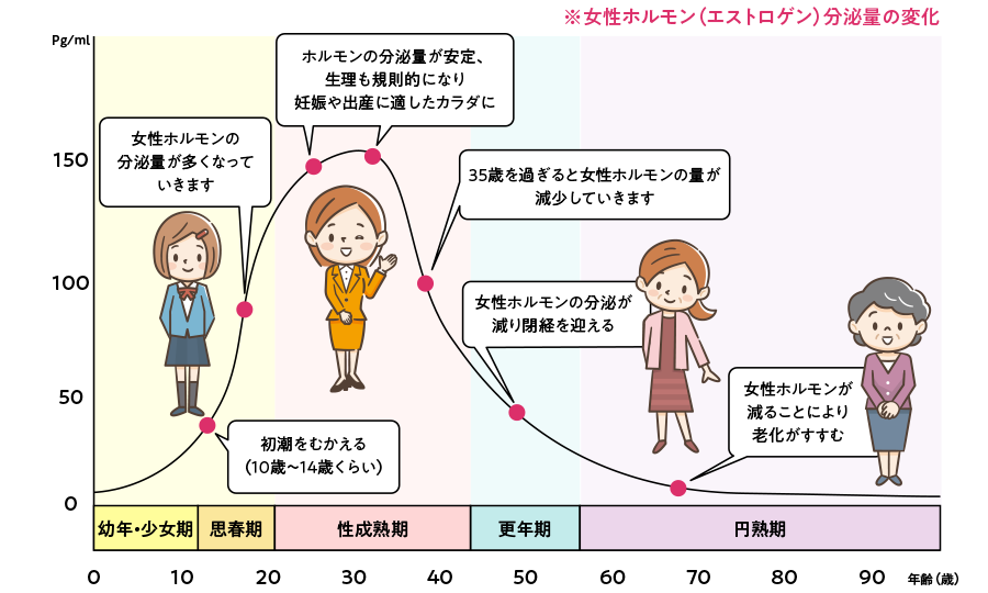 エストロゲンは、初潮を迎えた思春期のころから急激に分泌量は増え、20代半ばの性成熟期に分泌量はピークを迎えます。