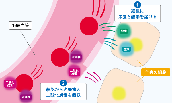 肌や臓器などの細胞ひとつひとつに栄養素や酸素を運び、老廃物や二酸化炭素を回収する働きを持っています。