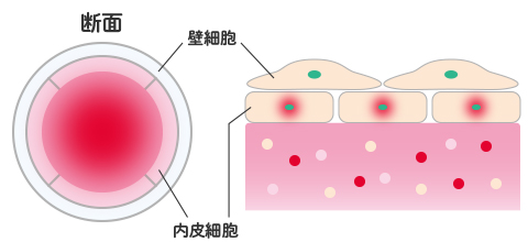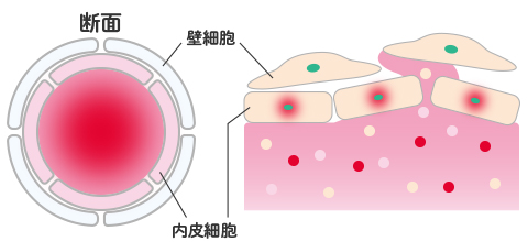 筒状の毛細血管は、内側の内皮細胞を外側の壁細胞が覆い、安定した構造を維持していますが、加齢や生活習慣の乱れ、ストレスなどでダメージを受けると細胞同士の結合が弱まり、栄養素や酸素が漏れやすくなってしまいます。