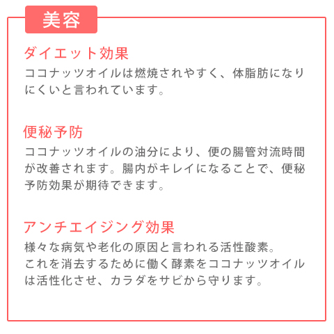 | 2.中鎖脂肪酸が豊富 | ココナッツオイルは天然の中鎖脂肪酸を豊富に含んでいます。中鎖脂肪酸は吸収が速く、すぐエネルギーとなるため、脂肪として体内に蓄積されにくいという特徴があります。 また、中鎖脂肪酸の1つであるラウリン酸には抗菌作用があり注目されています。 |