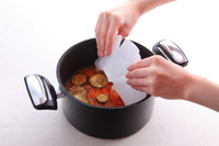 3. 《a》を加え、リード アクも油もとるシートをのせ、煮込む(約15分)。一旦火を止め、シートを取り、カレールウを加え、カレールウが溶けたら、再びとろみがつくまで弱火で煮込む。