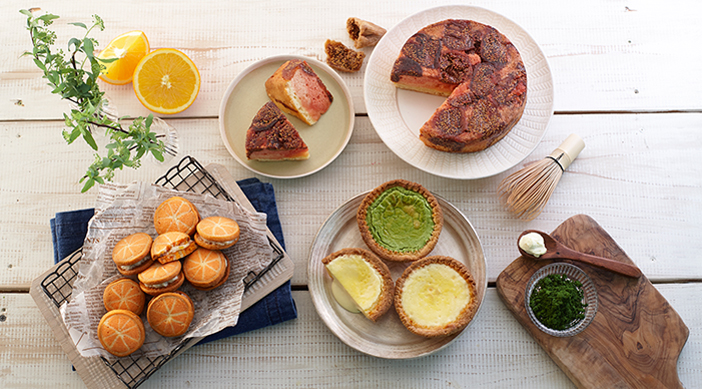 焼きたてはふわとろ、冷やすとなめらかな食感が楽しめるチーズタルトを作ります。アーモンドパウダーをふんだんに使用したシュクレ生地をタルト型に敷き込み、チーズのアパレイユを流して焼き上げます。プレーンと抹茶の2種類が楽しめます。