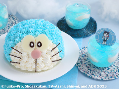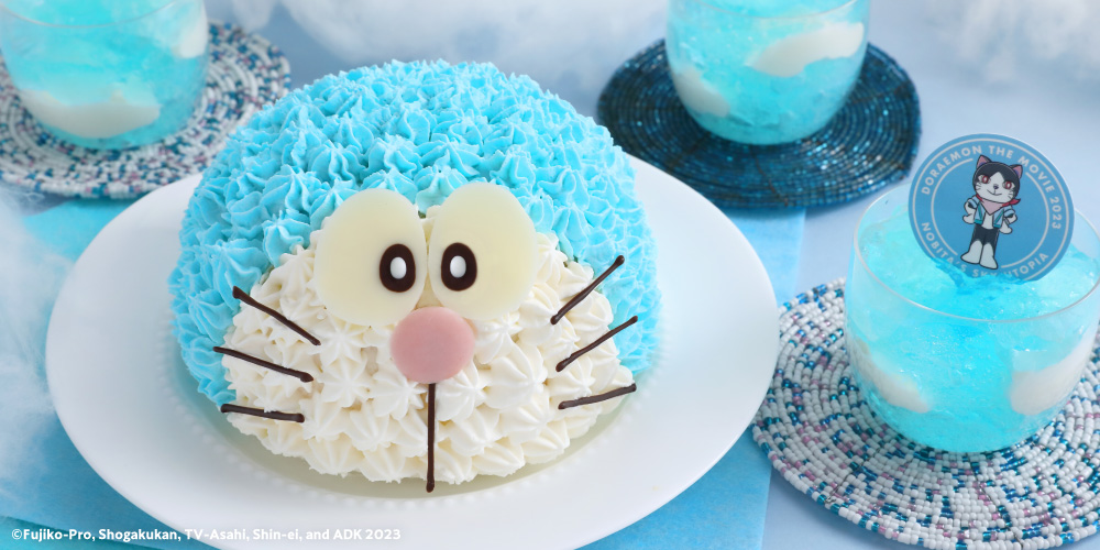 ドラえもんのフェイスがキュート!プレーンスポンジ・いちご・生クリームのケーキ。『映画ドラえもん のび太と空の理想郷(ユートピア)』をイメージして、ソーニャのピックをあしらったゼリーも作ります。