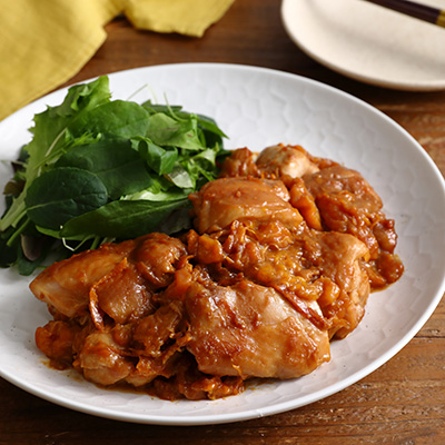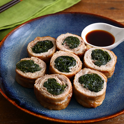 三重県産わかめの豚巻き、伊勢赤鶏の味柑焼き