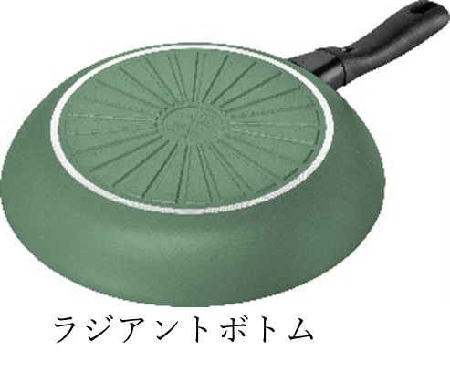 「コーティングだけでなく、しっかりと厚みを持たせ、放射状に溝をつけた底面も特長。熱による変形を防ぎ、ゆがみにくい構造となっていることから一つのフライパンを長くお使いいただけます。
