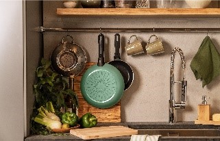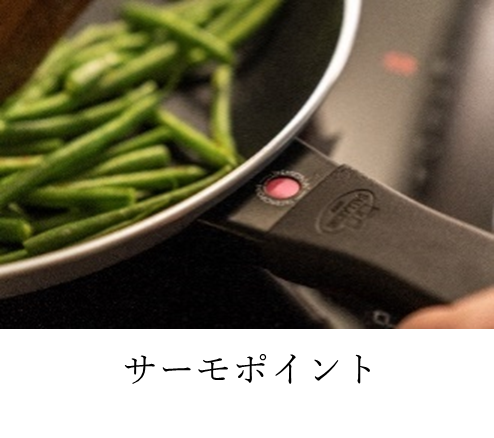 「Caprera(カプレラ)」の底面は、熱が効率的に広がる熱伝導に優れたラジアントボトムを採用。これにより均一に熱が広がり、一度温まれば熱をしっかり蓄え、弱~中火で十分な調理が可能となります。また、ケラグロス・コーティングは、ツルっとしたなめらかな表面構造のため、食材に熱が効率的に伝わります。更に、調理を始める適温が一目でわかる「サーモポイント」を搭載。ハンドル根元の緑色の丸が加熱することにより赤色に変わることで予熱完了の合図。調理後も、緑色に戻ってから洗浄することで、急激な温度変化がなくなり、コーティングの性能を長持ちさせます。これにより、無駄な加熱や余分なガス代(電気代)の削減をサポートし、毎日の料理を省エネで環境にやさしいものに。